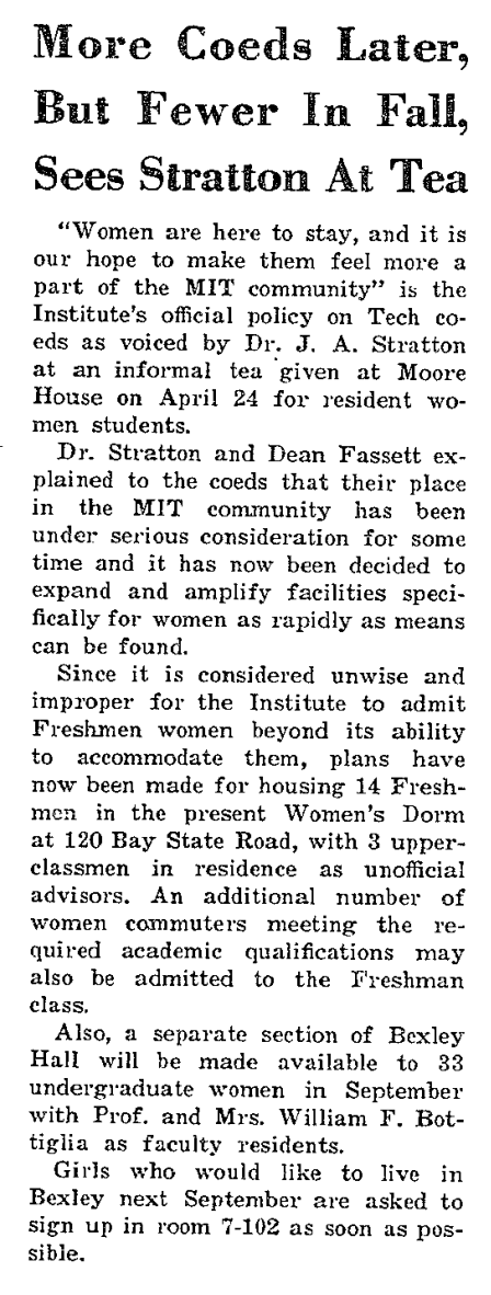 | Title | More Coeds Later, But Fewer In Fall, Sees Stratton At Tea, from The Tech Vol 77, No 18, April 26, 1957 |